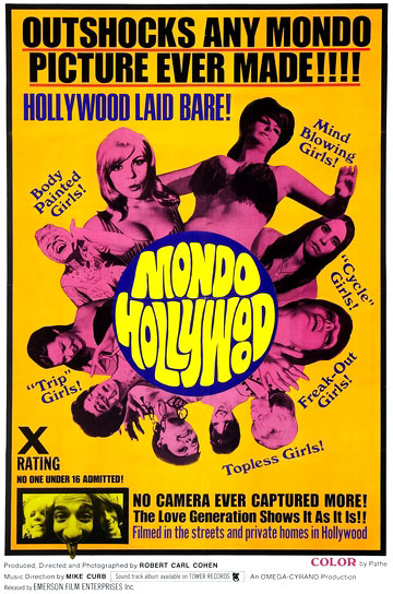 MONDO HOLLYWOOD 1967 U.S. documentary. The complete and uncensored guide to psychedelic sixties Hollywood! Stuff you'll see: Terrific shots of Sunset Strip nightlife including the Whisky A-Go-Go and the Trip, big bosomed "Jenny Lee" the inspiration for the Jan & Dean song, cool skateboarding footage, 60s make-up and hairstyling including hairstylist Jay Sebring (murdered by Manson Family), surfer scenes, "Peanuts" the transvestite, Captain F*ck and Vito the King of the Hippies.