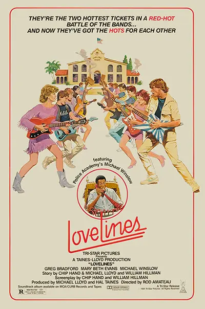 Lovelines is a wild mix of hormones, guitars, and teenage defiance. It's packed with sex, drugs, and dirty dealings, all wrapped in a neon-lit, high-energy battle for love and music. Greg Bradford, Mary Beth Evans, Michael Winslow, Don Michael Paul, Tammy Taylor, Miguel Ferrer, Shecky Greene.